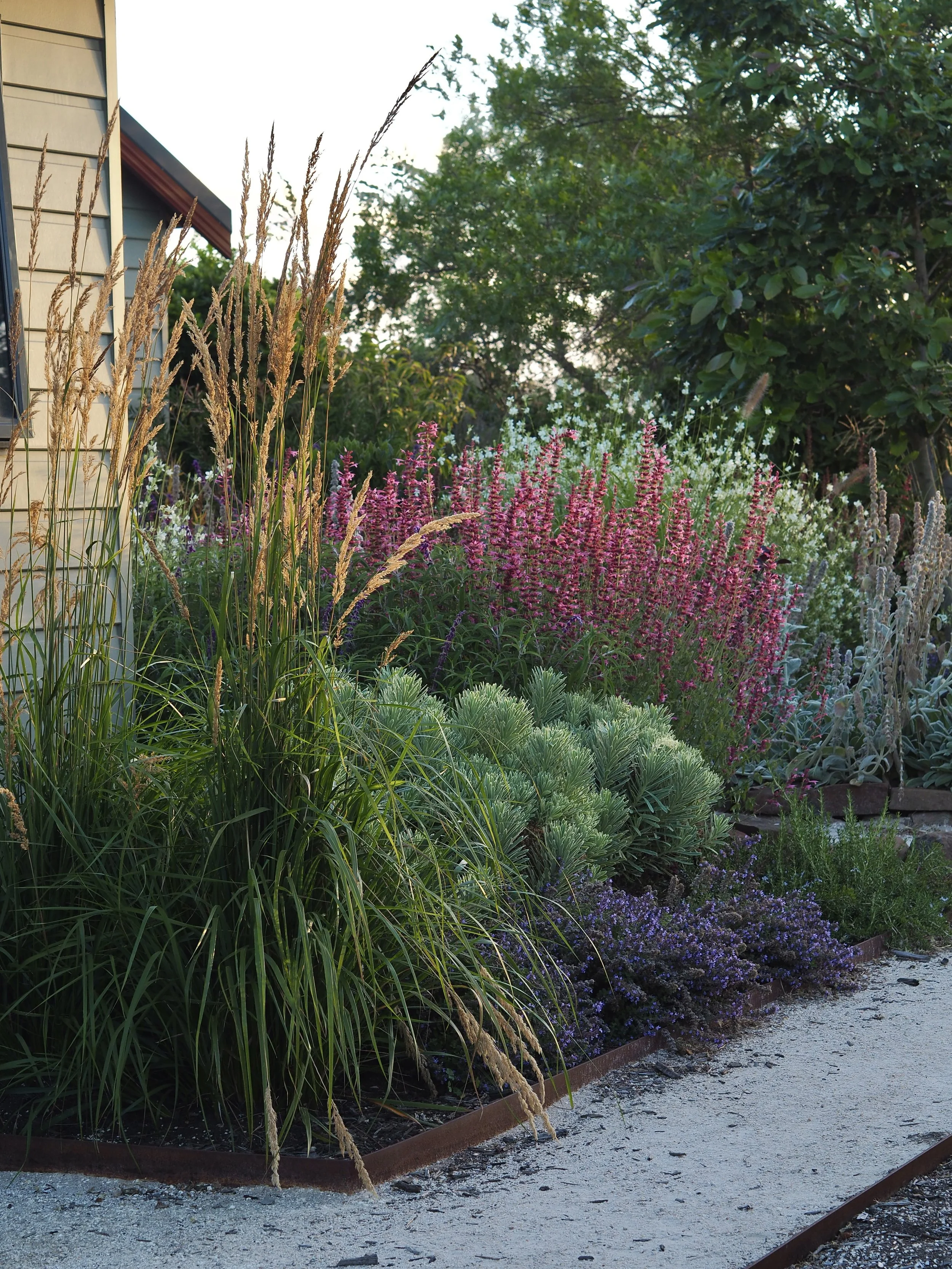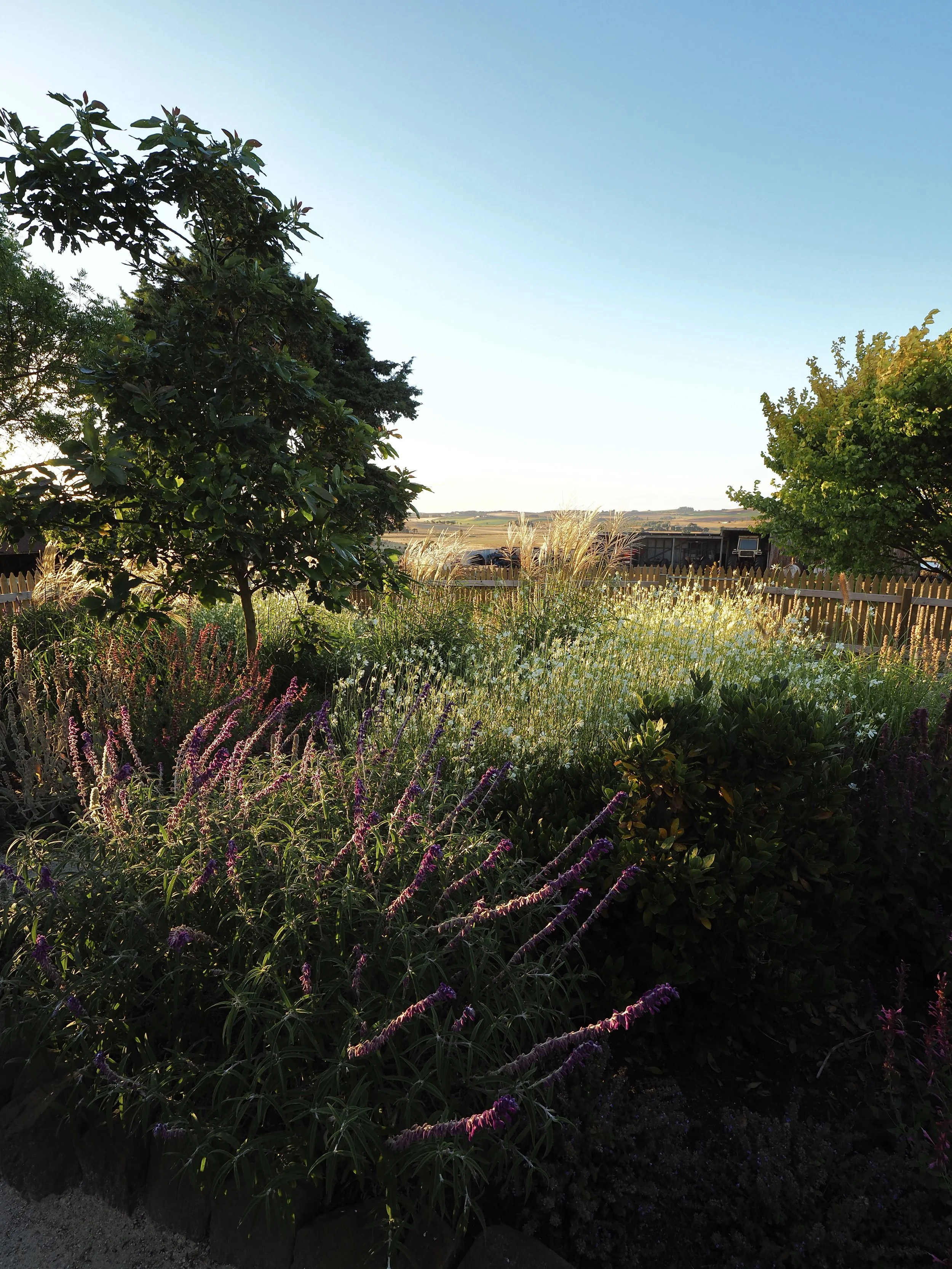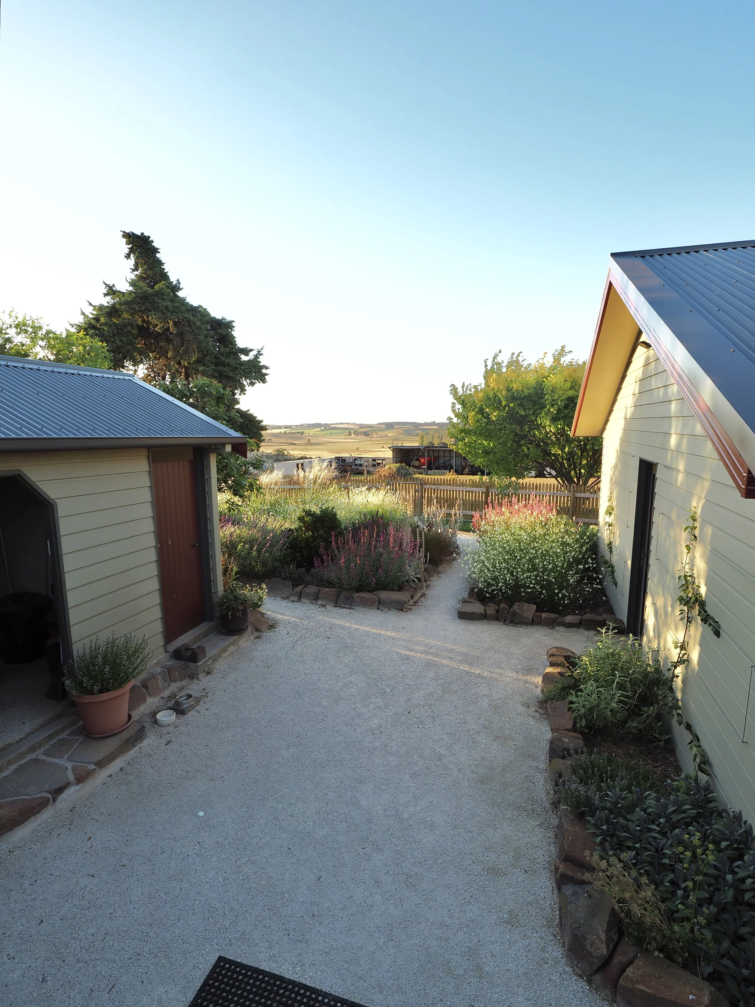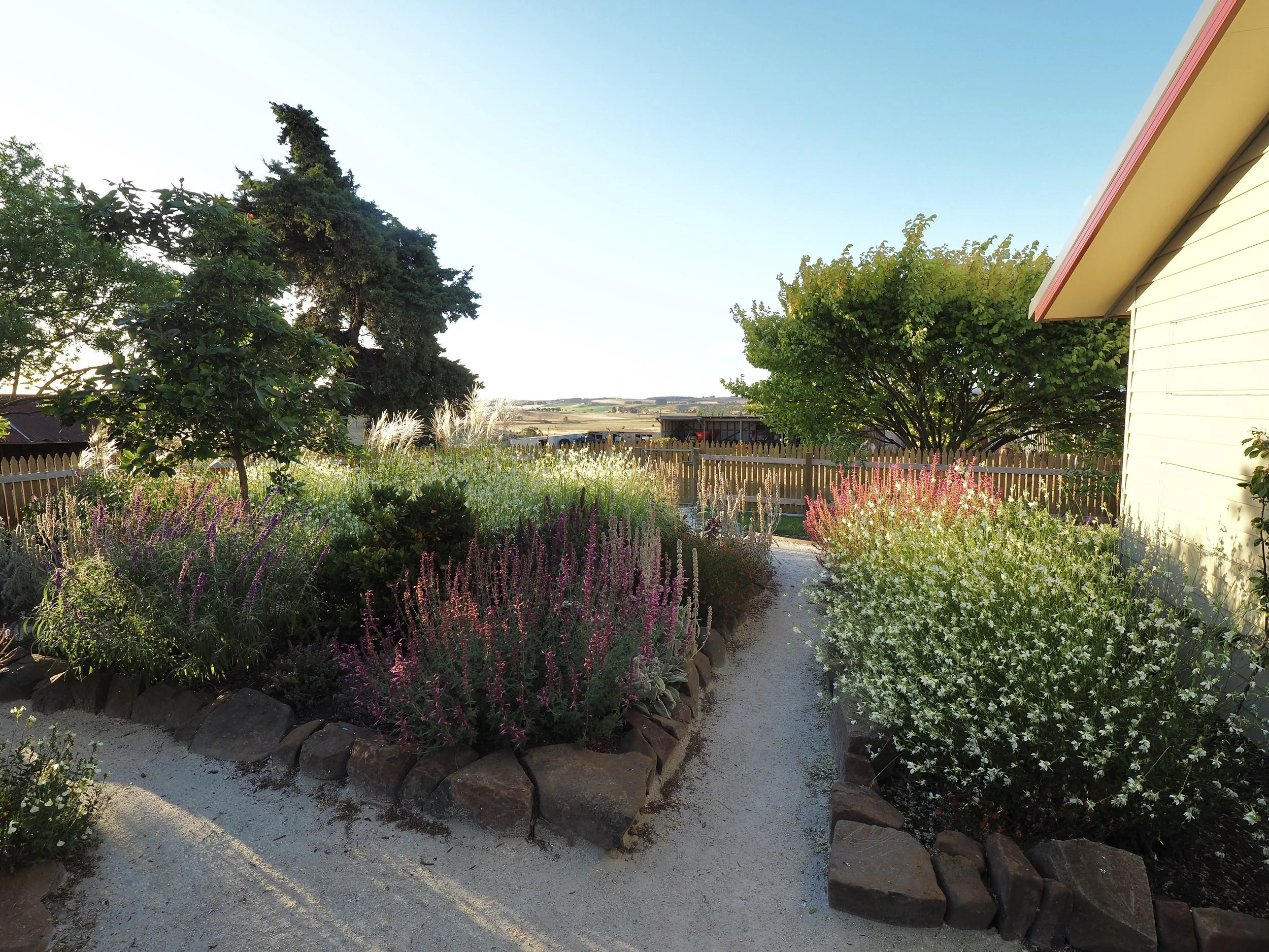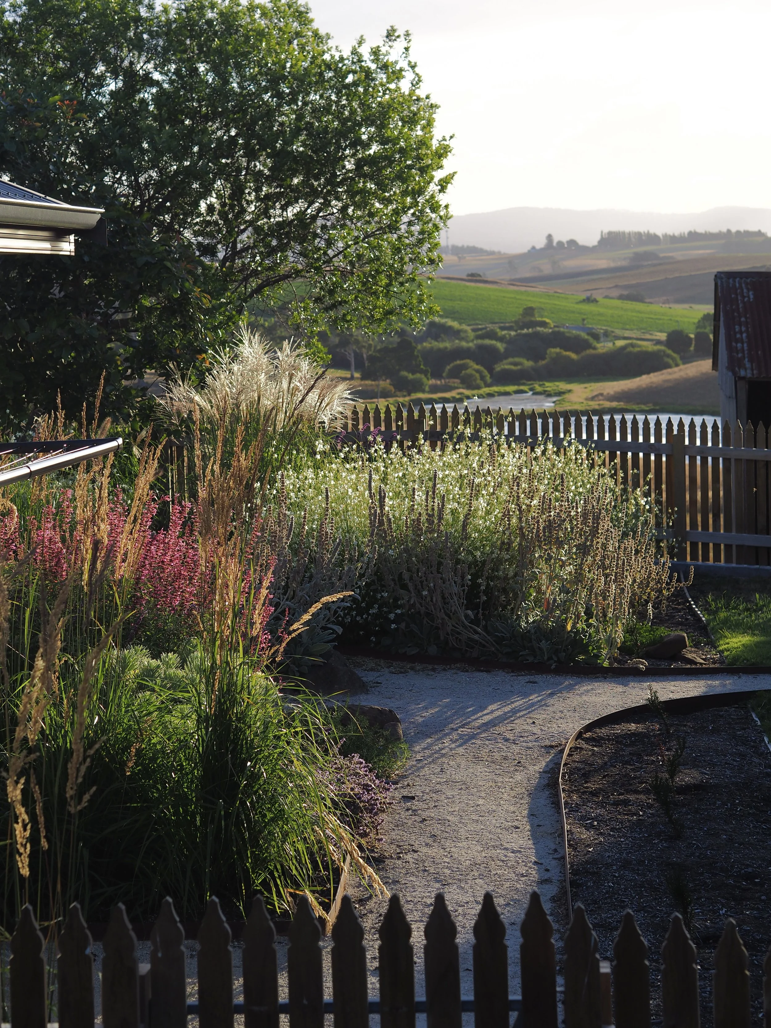 A new garage construction created an opportunity to redesign an under-utilised space into an inviting entry garden and courtyard for this farmhouse on a hill. Removing an old existing paling fence and pushing the boundary out into the farm yard has brought the spectacular views of the surrounding landscape into the garden, which features a mix of long flowering, tough perennials and ornamental grasses, espaliered crab apples, a herb garden and stone garden edging that was salvaged and reconfigured from the old garden