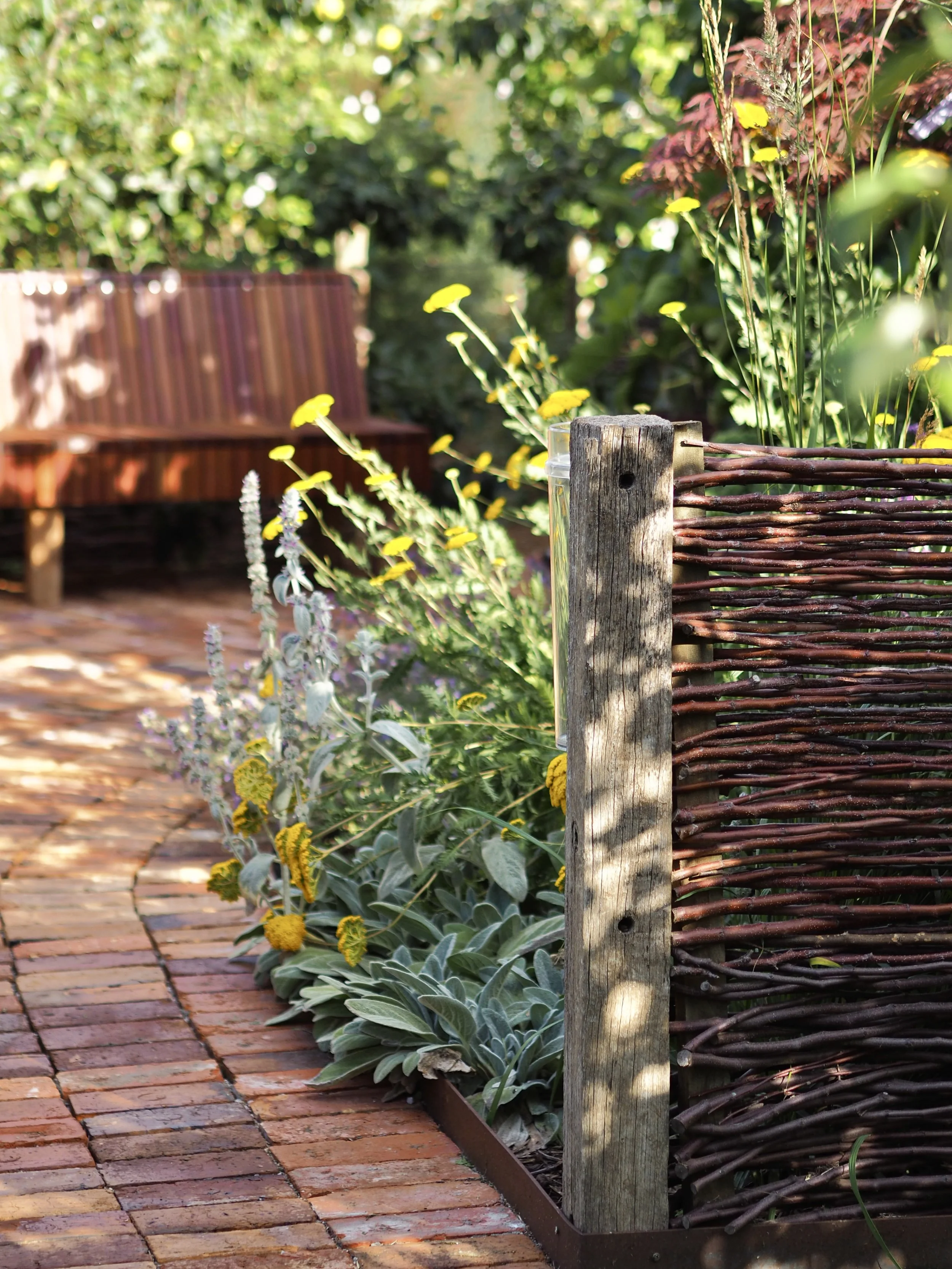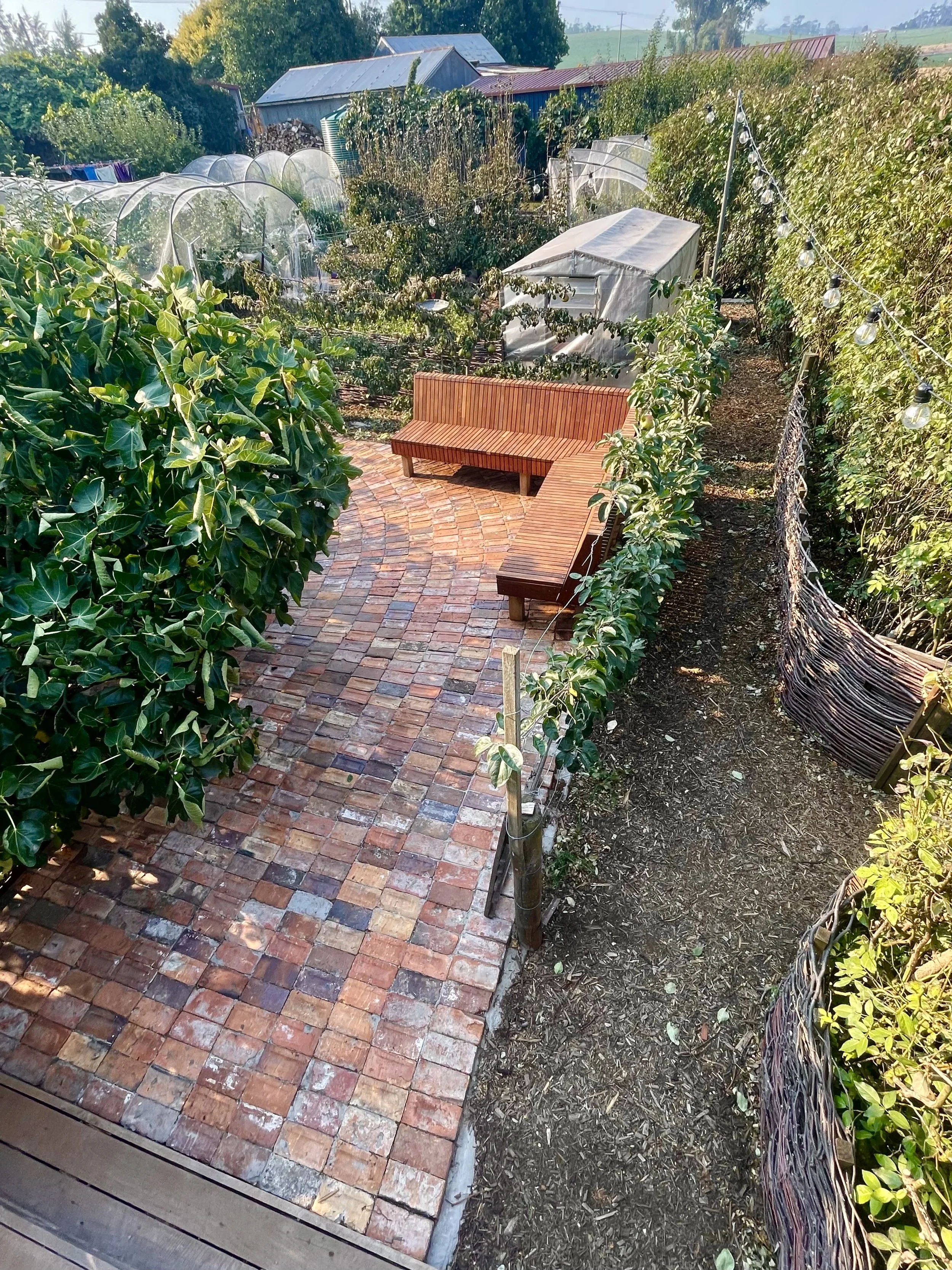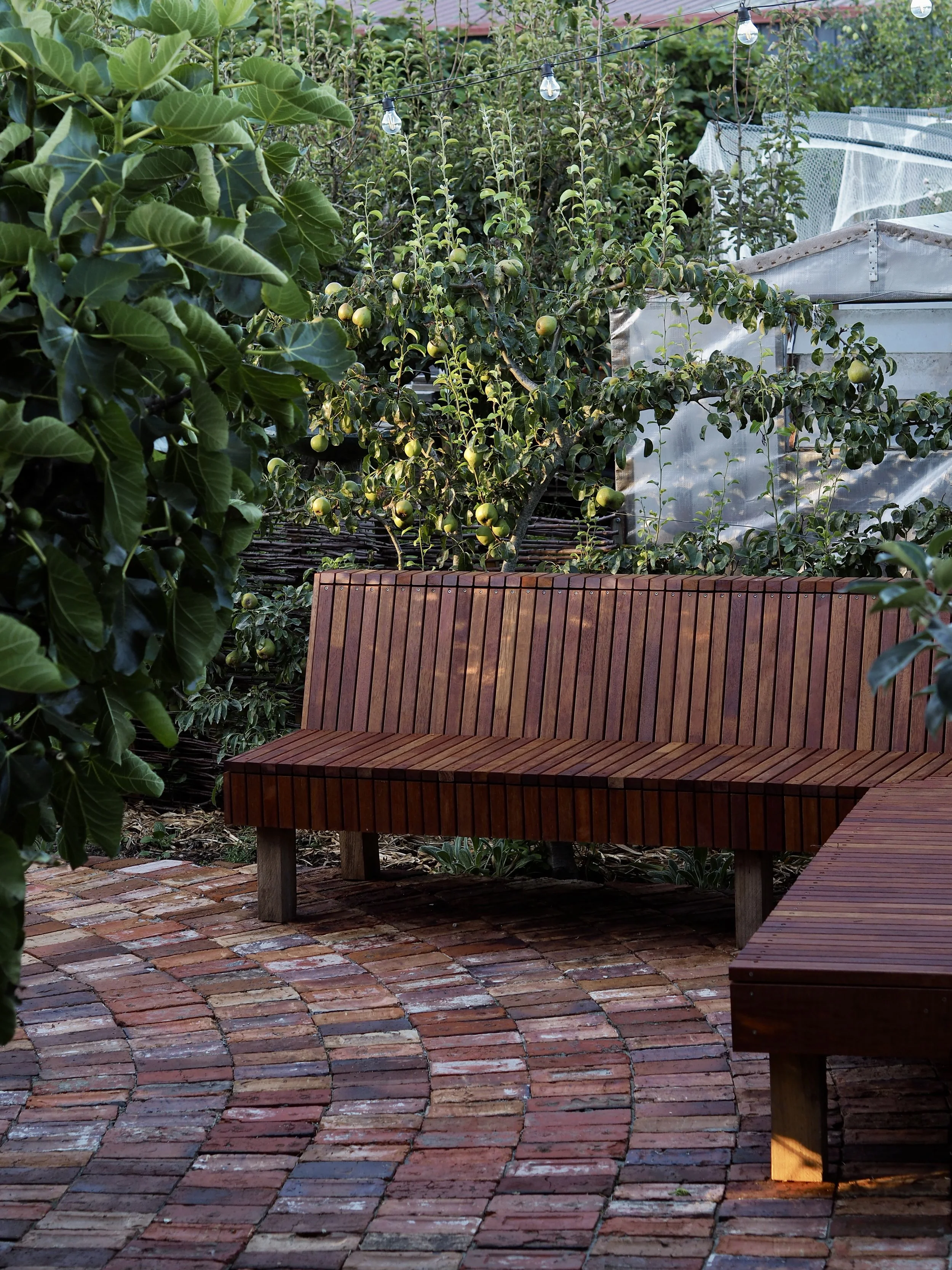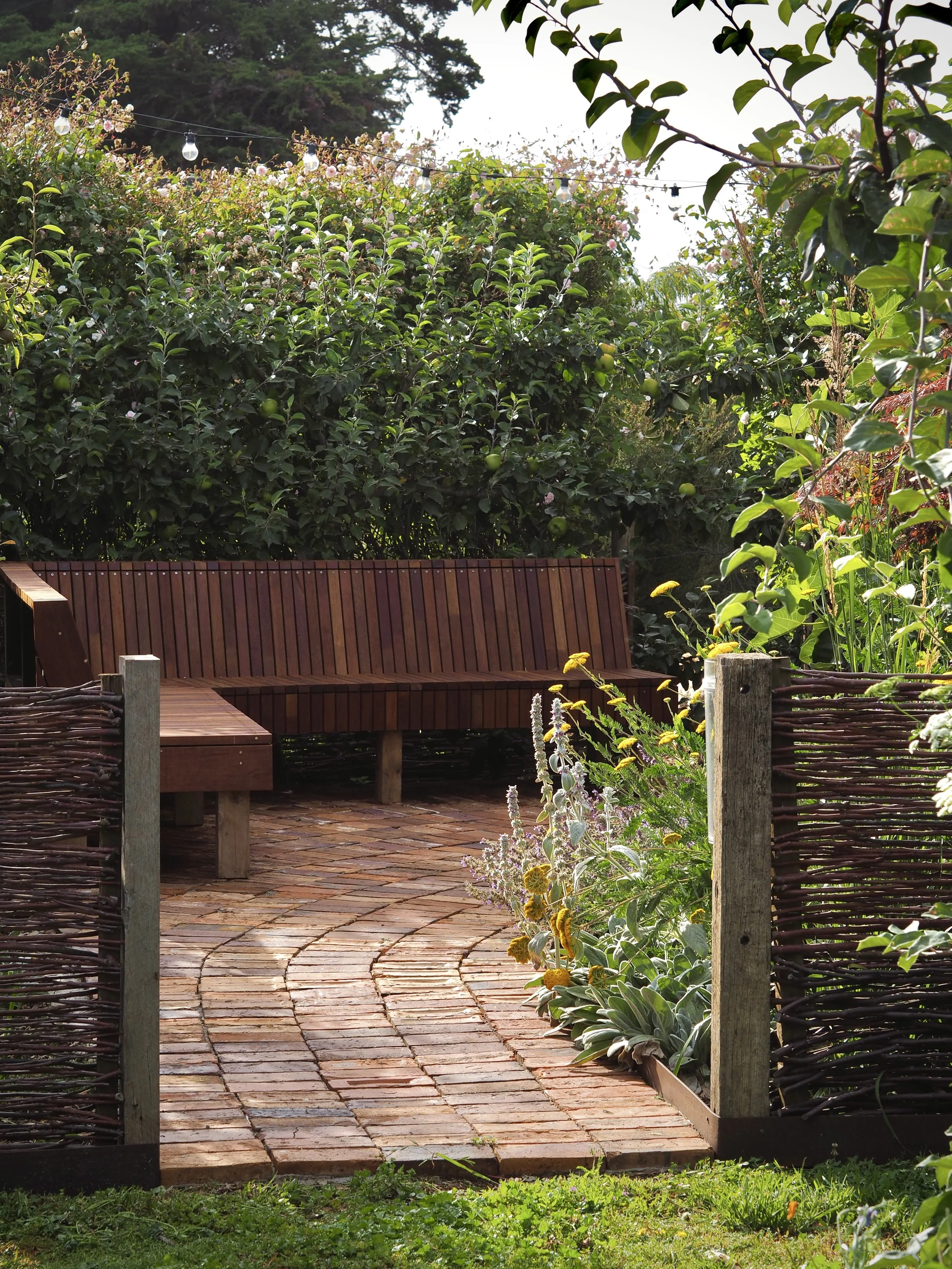 This project was all about creating an intimate, inviting space within a much larger garden. We enclosed the courtyard with fences weaved with our winter apple tree prunings, installed reclaimed red brick paving and fabricated a bespoke timber bench seat using offcuts from a previous project. With established fruit trees already in the courtyard, we complimented them with a mix of tough, long flowering perennials. In many ways, this project expresses what we are all about at Panamona - thoughtful, conscious design that is sympathetic to its location, without compromising on its beauty and functionality.