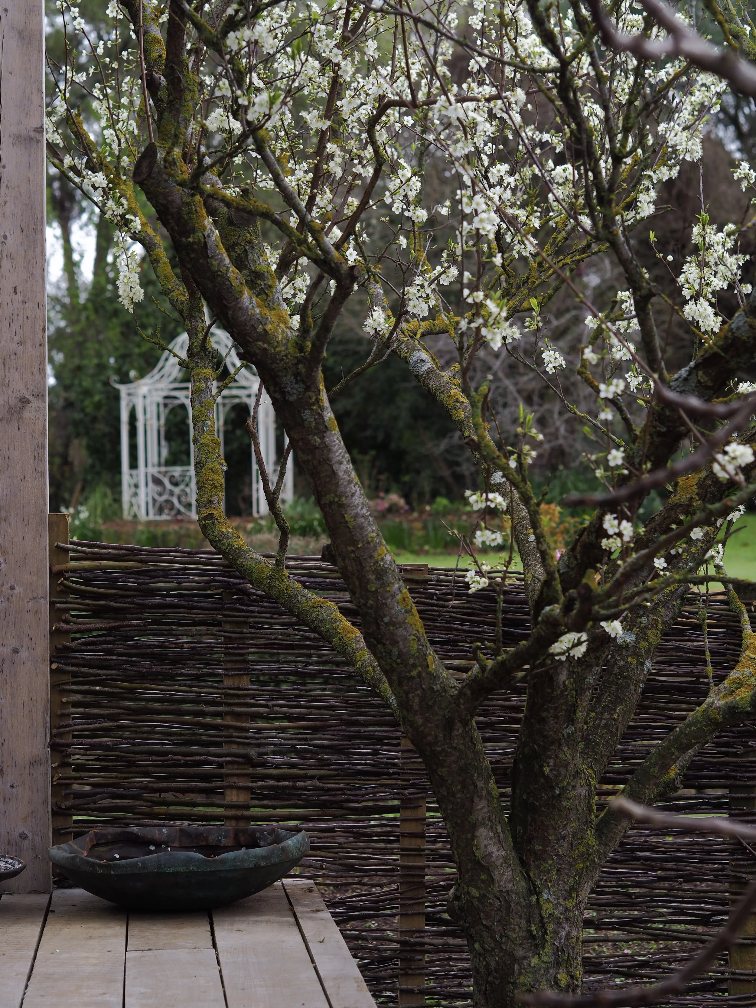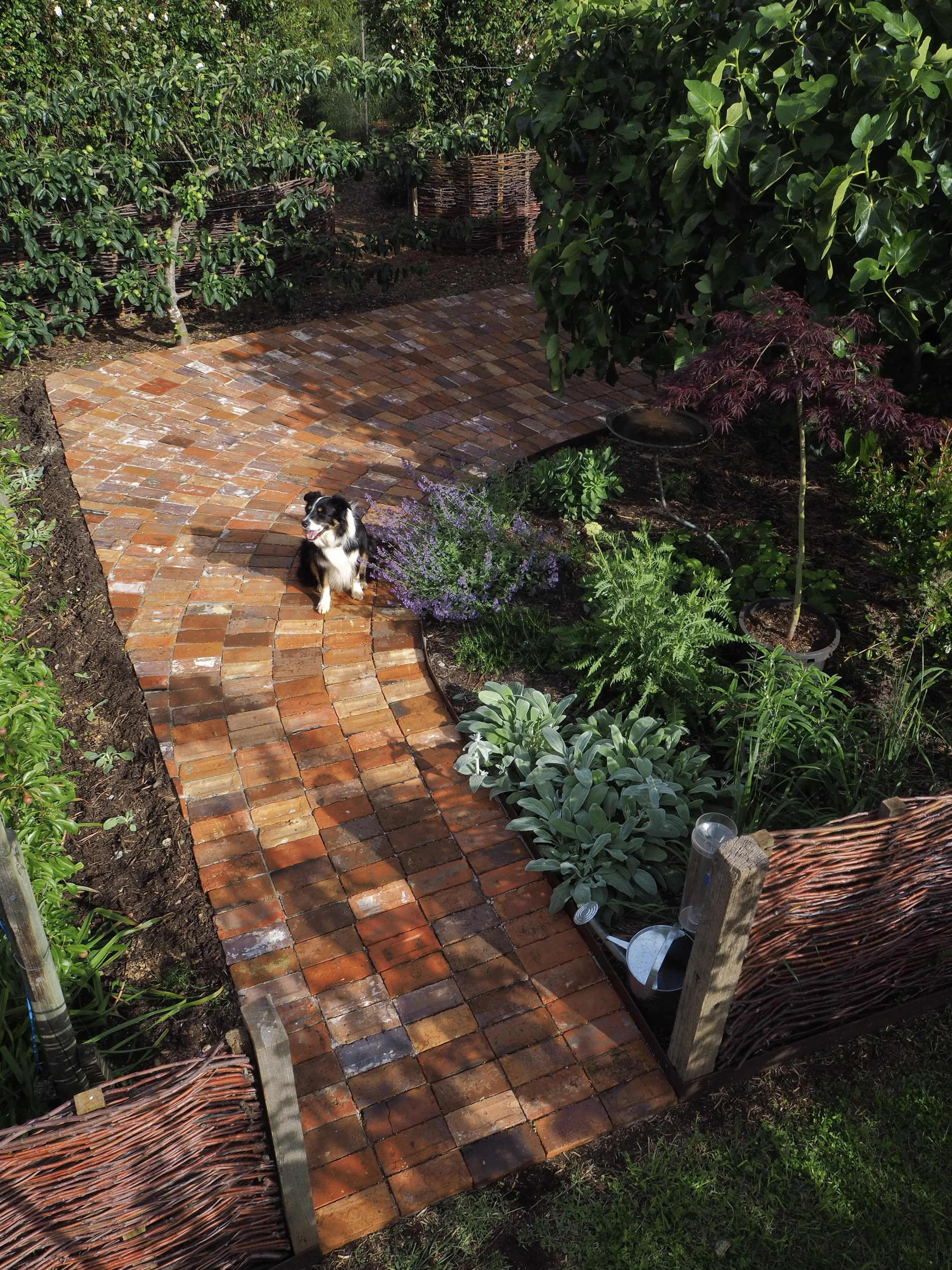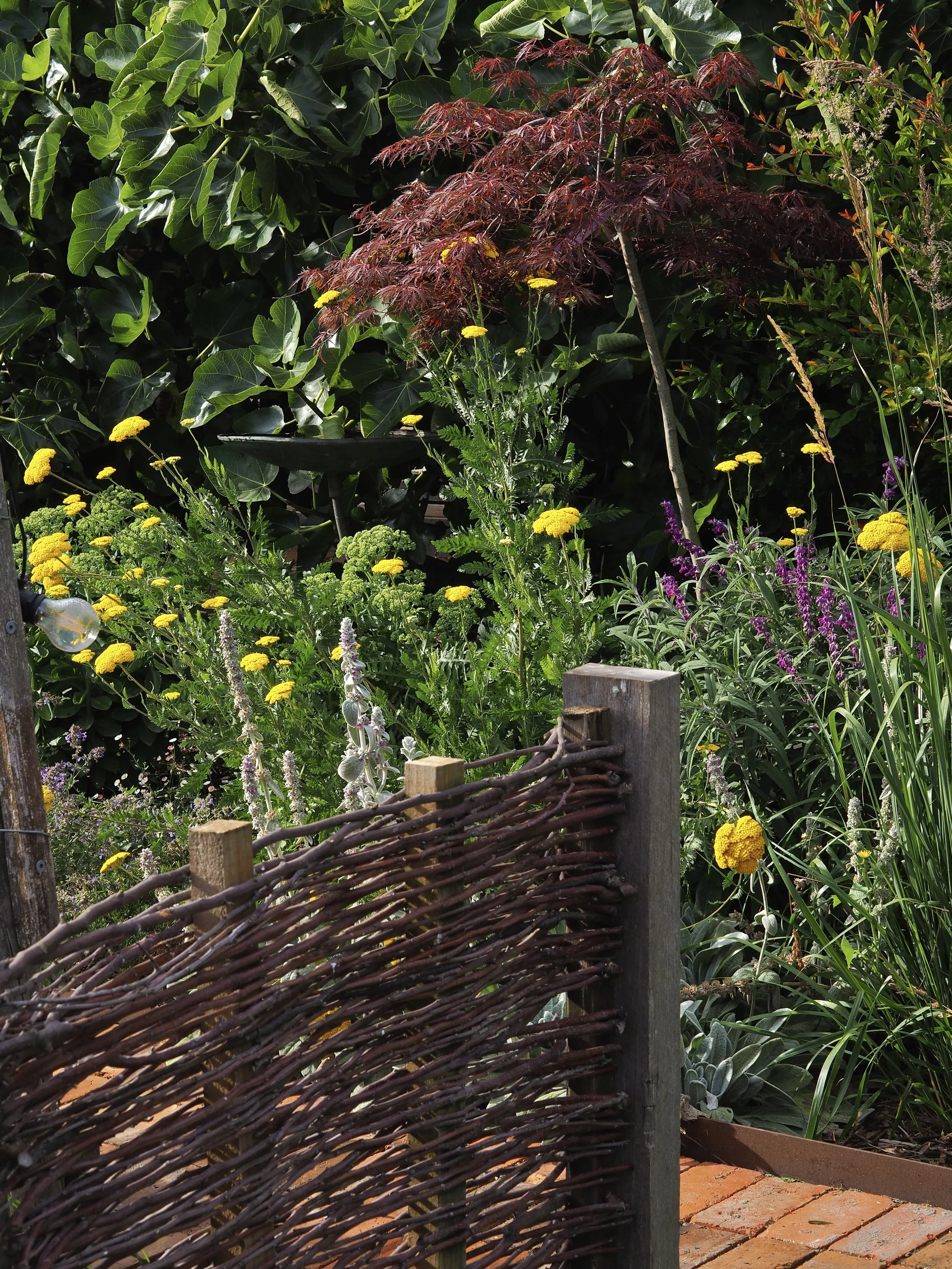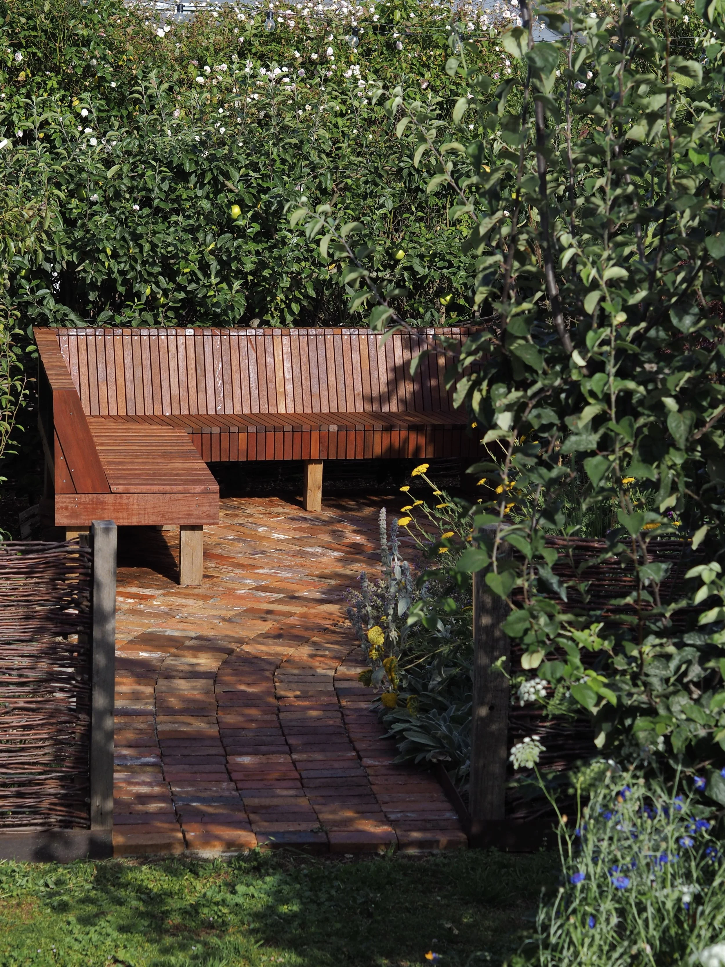 This project was all about creating an intimate, inviting space within a much larger garden. We enclosed the courtyard with fences weaved with our winter apple tree prunings, installed reclaimed red brick paving and fabricated a bespoke timber bench seat using offcuts from a previous project. With established fruit trees already in the courtyard, we complimented them with a mix of tough, long flowering perennials. In many ways, this project expresses what we are all about at Panamona - thoughtful, conscious design that is sympathetic to its location, without compromising on its beauty and functionality.